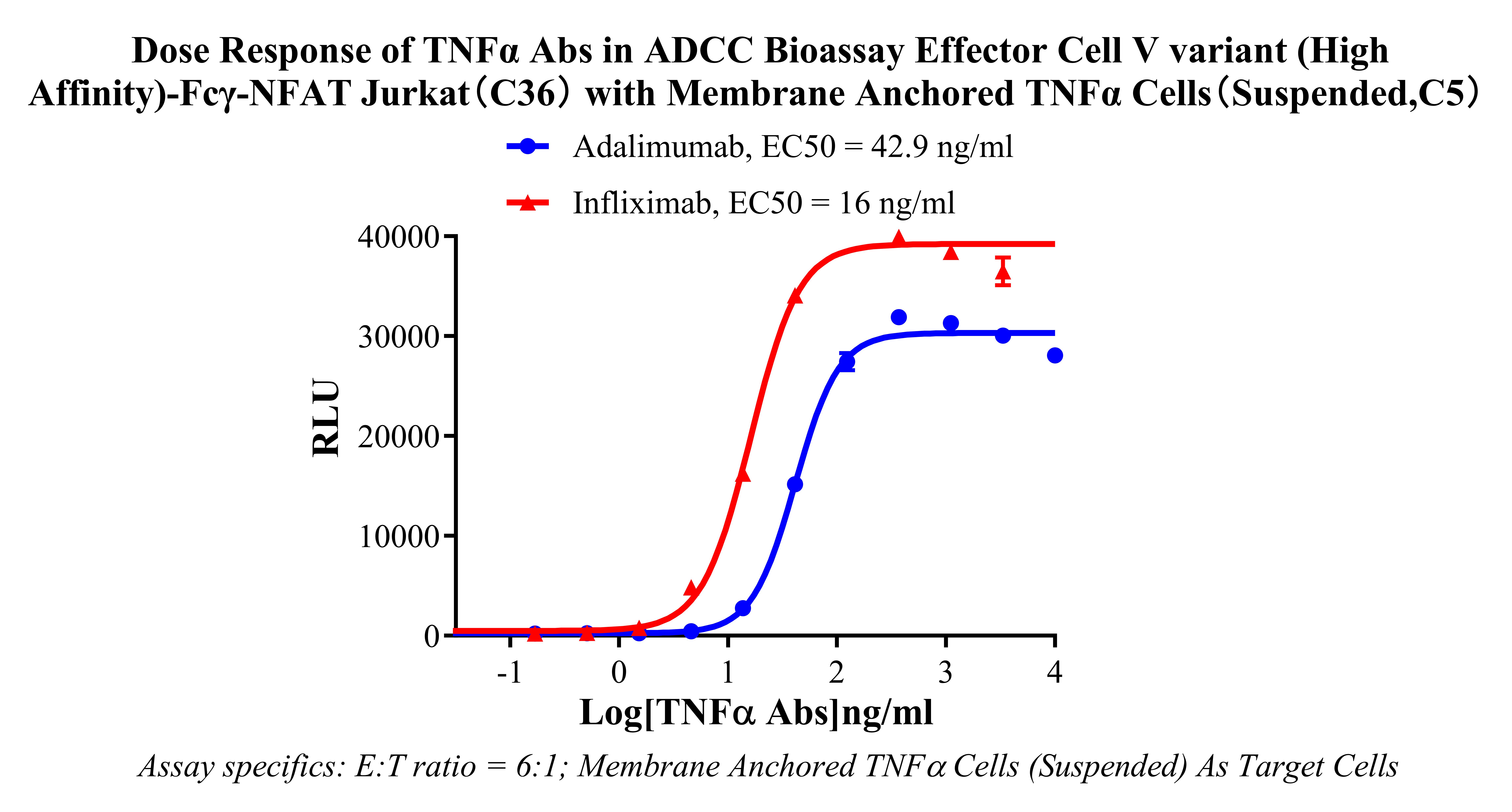 Figure 2. Dose response of TNFα Abs in ADCC Bioassay Effector Cell V variant (High Affinity)-Fcγ-NFAT Jurkat (C36) with Membrane Anchored TNFα Cell (Suspended, C5).