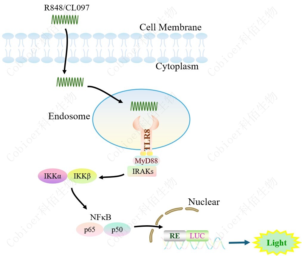 TLR8 NFκB-Luc HEK293 報告基因藥靶模型很好的模擬了體內(nèi) TLR8 的信號轉(zhuǎn)導過程, 原理見下圖所示。