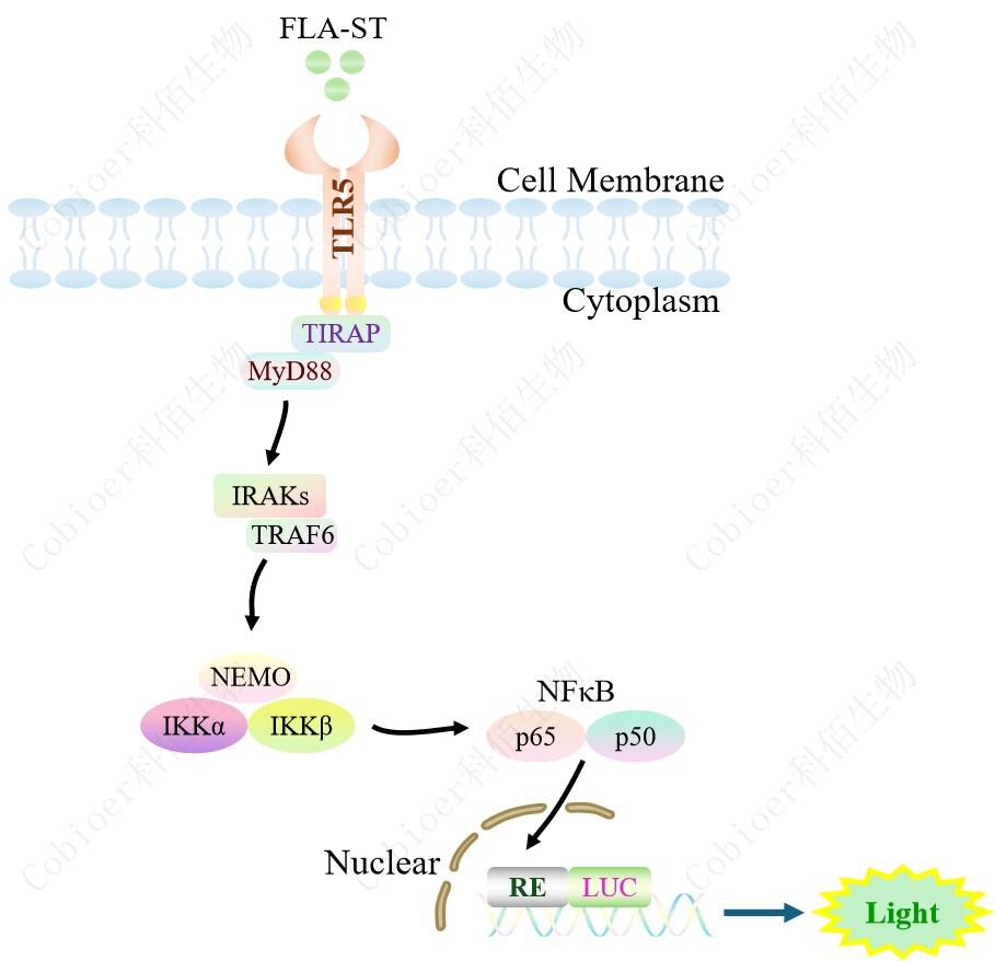 TLR5 NFκB-Luc HEK293 報(bào)告基因藥靶模型很好的模擬了體內(nèi) TLR5 的信號轉(zhuǎn)導(dǎo)過程, 原理見下圖所示。