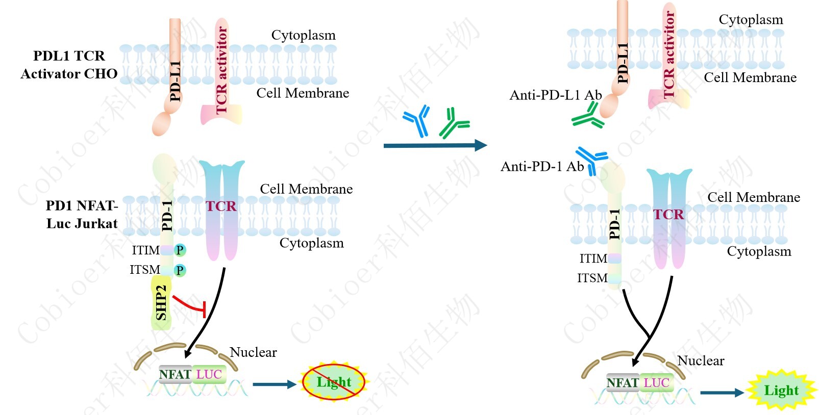 PDL1 TCR Activator CHO 細(xì)胞作為 PD1 NFAT-Luc Jurkat 細(xì)胞的靶細(xì)胞,很好的模擬了 體內(nèi) PD1&PDL1 的信號(hào)轉(zhuǎn)導(dǎo)過程,原理見下圖所示。