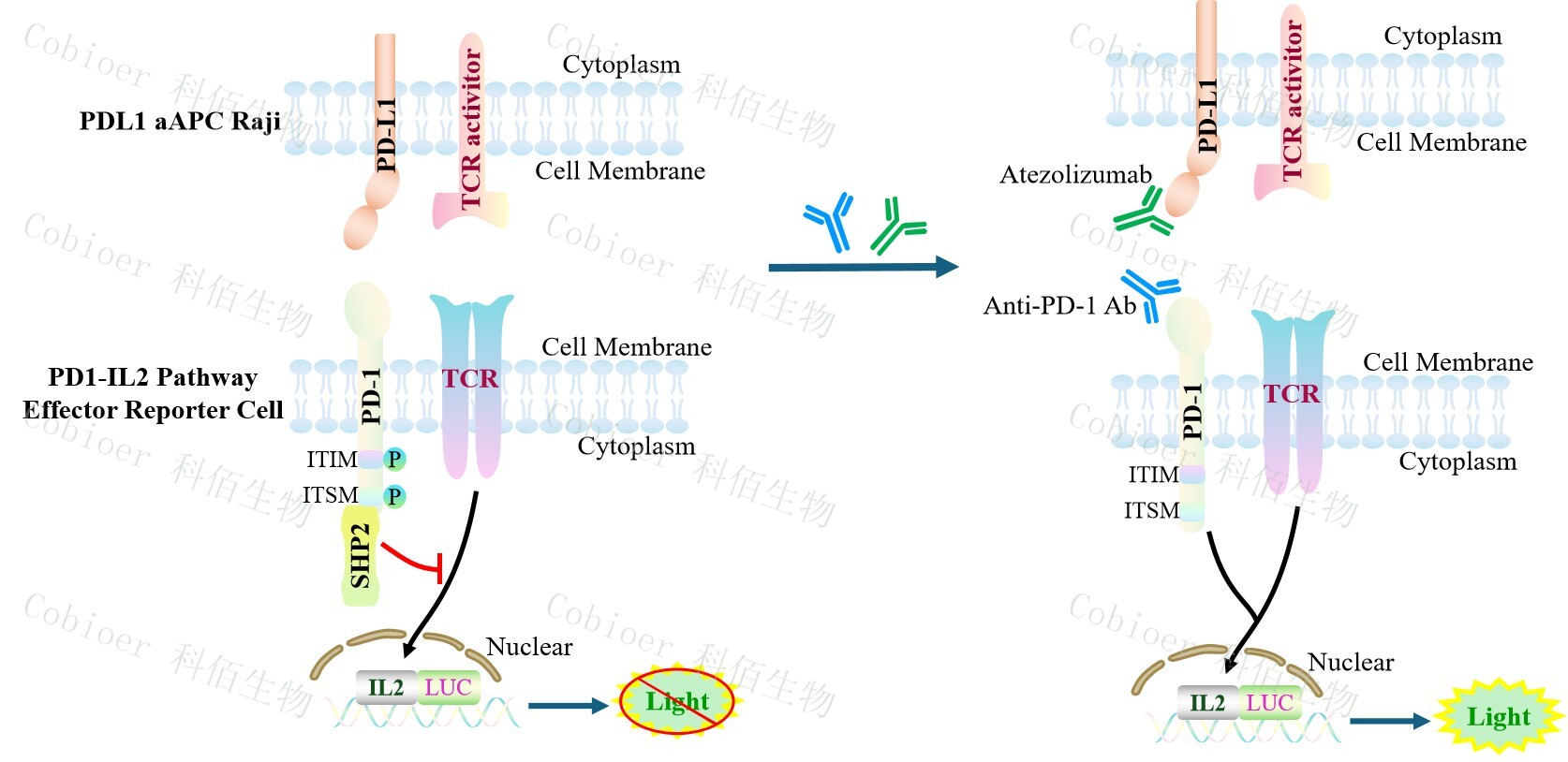 PDL1 aAPC Raji 作為 PD1-IL2 Pathway Effector Reporter Cell 的靶細(xì)胞,藥靶模型很好 的模擬了體內(nèi) PD1&PDL1 的信號轉(zhuǎn)導(dǎo)過程,原理見下圖所示。![]() Figure 1. PDL1 aAPC Raji 模型原理圖