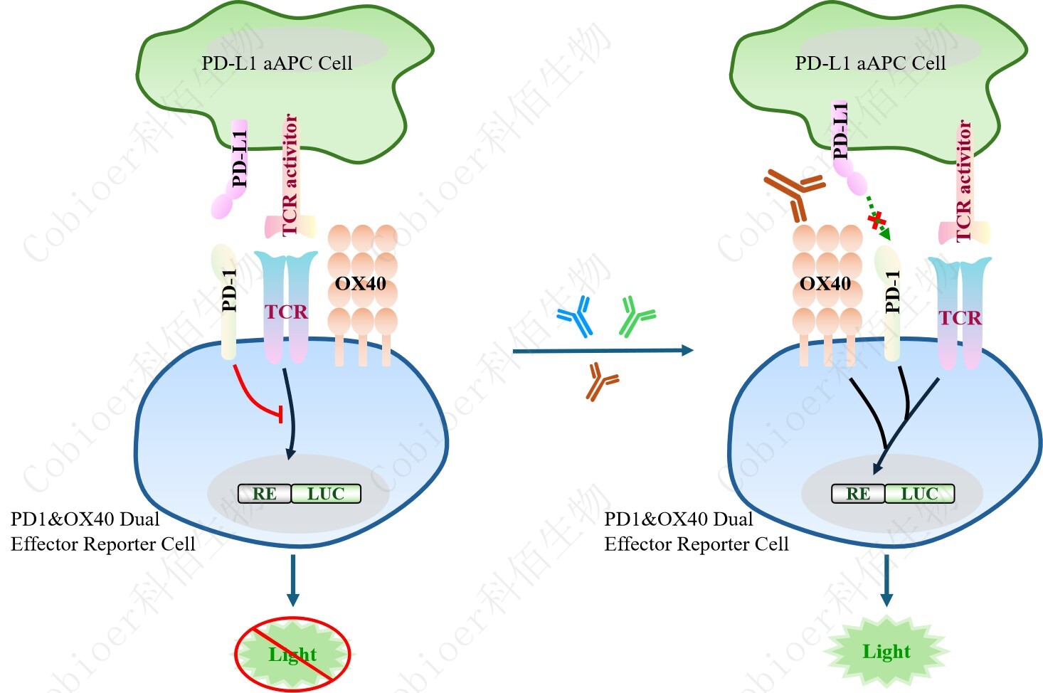 PD1&OX40 Dual Effector Reporter Cell 報告基因藥靶模型很好的模擬了體內(nèi) PD1&OX40 的信號轉(zhuǎn)導(dǎo)過程,原理見下圖所示。
