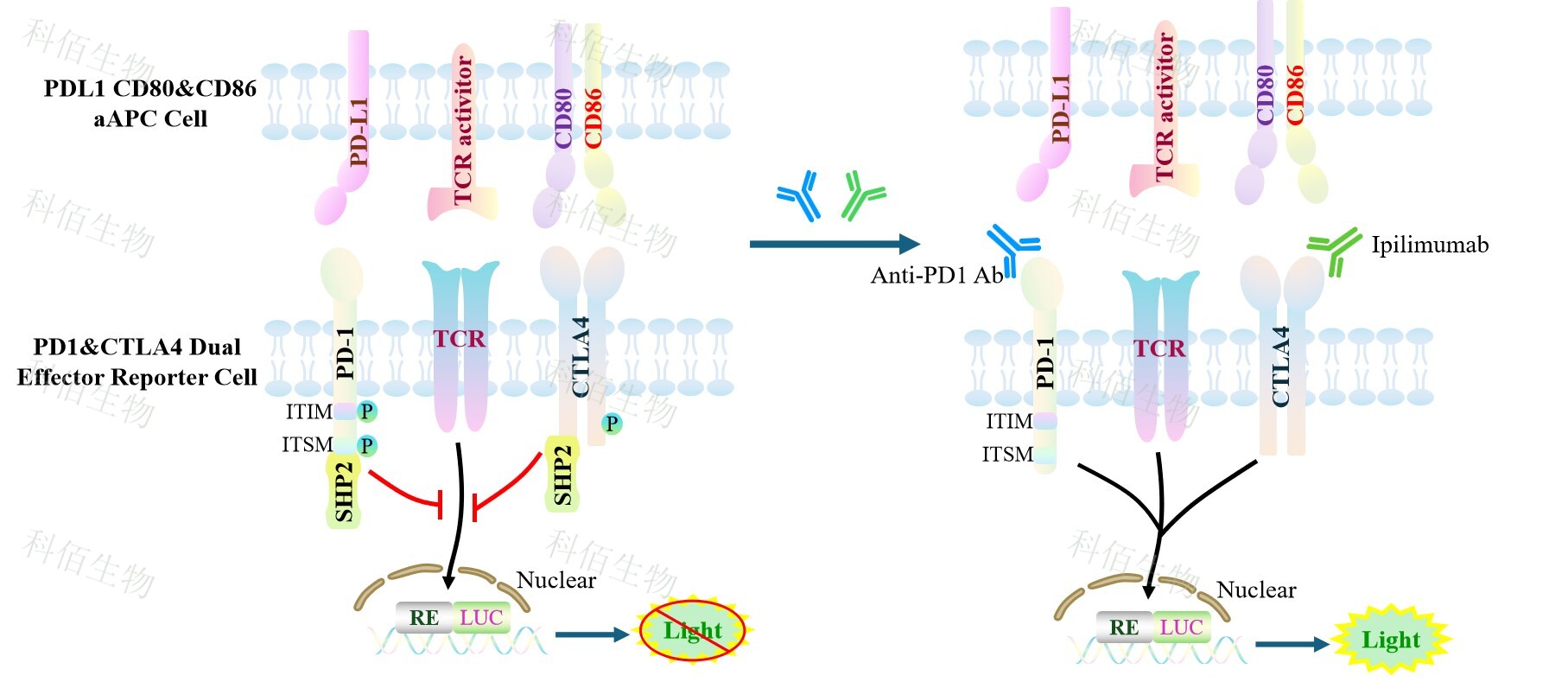 PDL1 CD80&CD86 aAPC Cell 作為 PD1&CTLA4 Dual Effector Reporter Cell 的靶細(xì)胞,很好的模擬了體內(nèi) PD1&CTLA4 的信號(hào)轉(zhuǎn)導(dǎo)過(guò)程,原理見(jiàn)下圖所示。