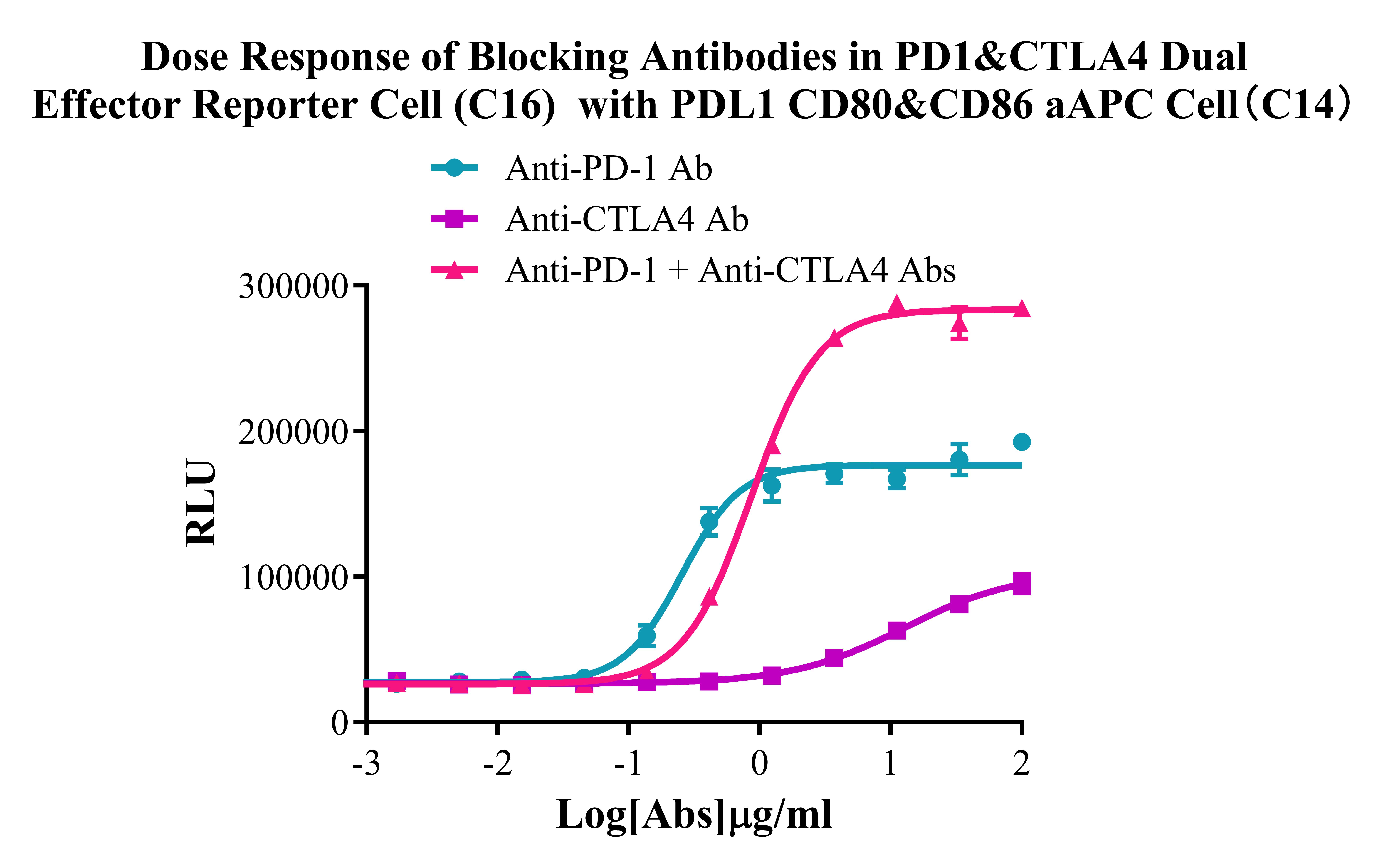 Figure 2. Dose Response of Blocking Antibodies in PD1&CTLA4 Dual Effector Reporter Cell (C16) With PD-L1 CD80&CD86 aAPC Cell (C14). |