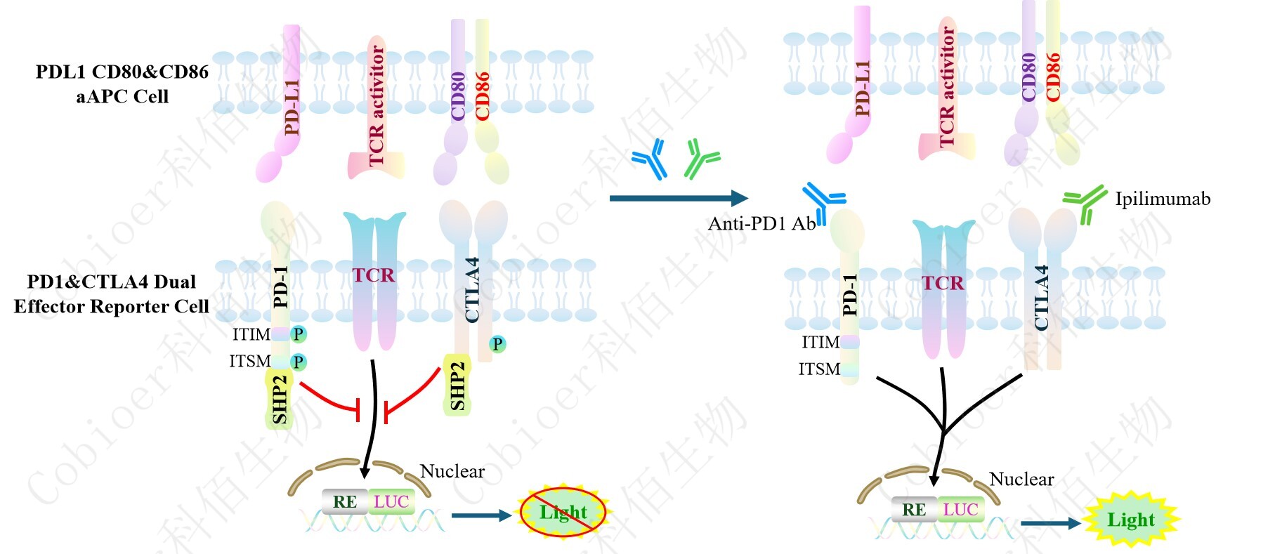 PD1&CTLA4 Dual Effector Reporter Cell 報(bào)告基因藥靶模型很好的模擬了體內(nèi) PD1&CTLA4 的信號轉(zhuǎn)導(dǎo)過程,原理見下圖所示。