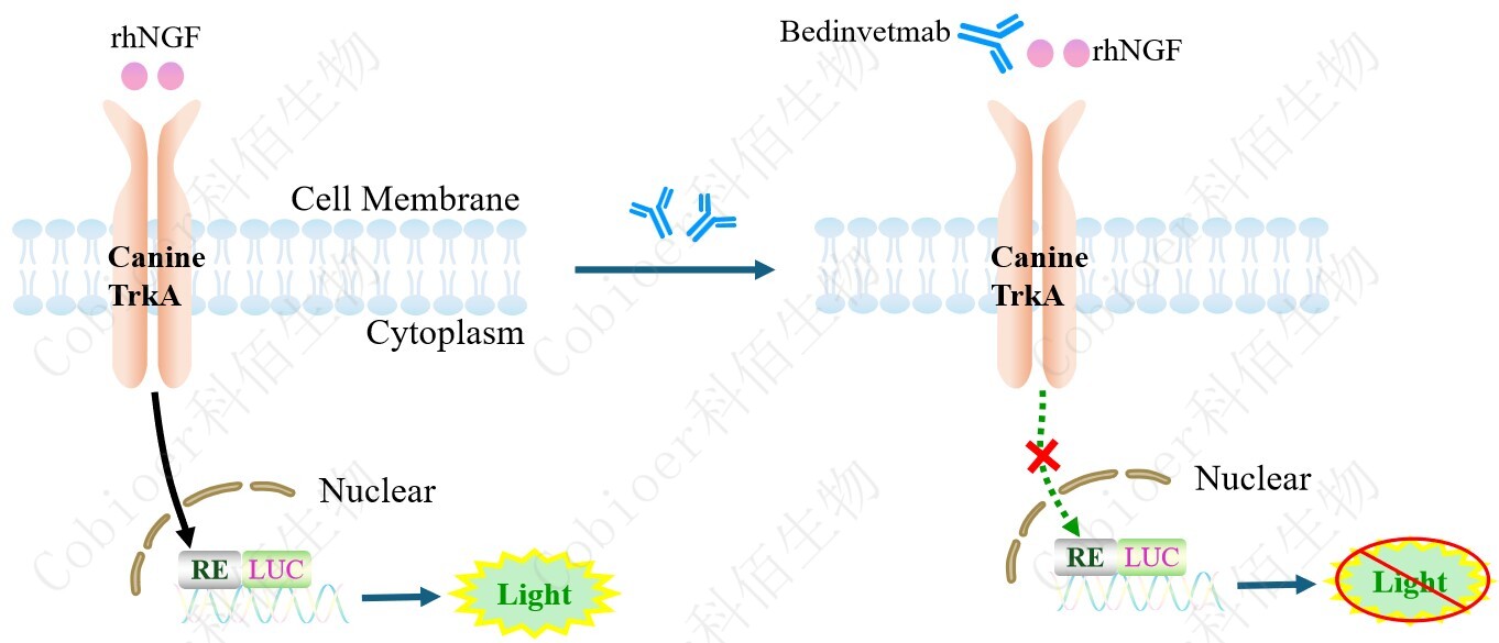 NGF/Canine TRKA Effector Reporter Cell 報告基因藥靶模型很好的模擬了體內(nèi) NGF/Canine TRKA 的信號轉(zhuǎn)導過程,原理見下圖所示。