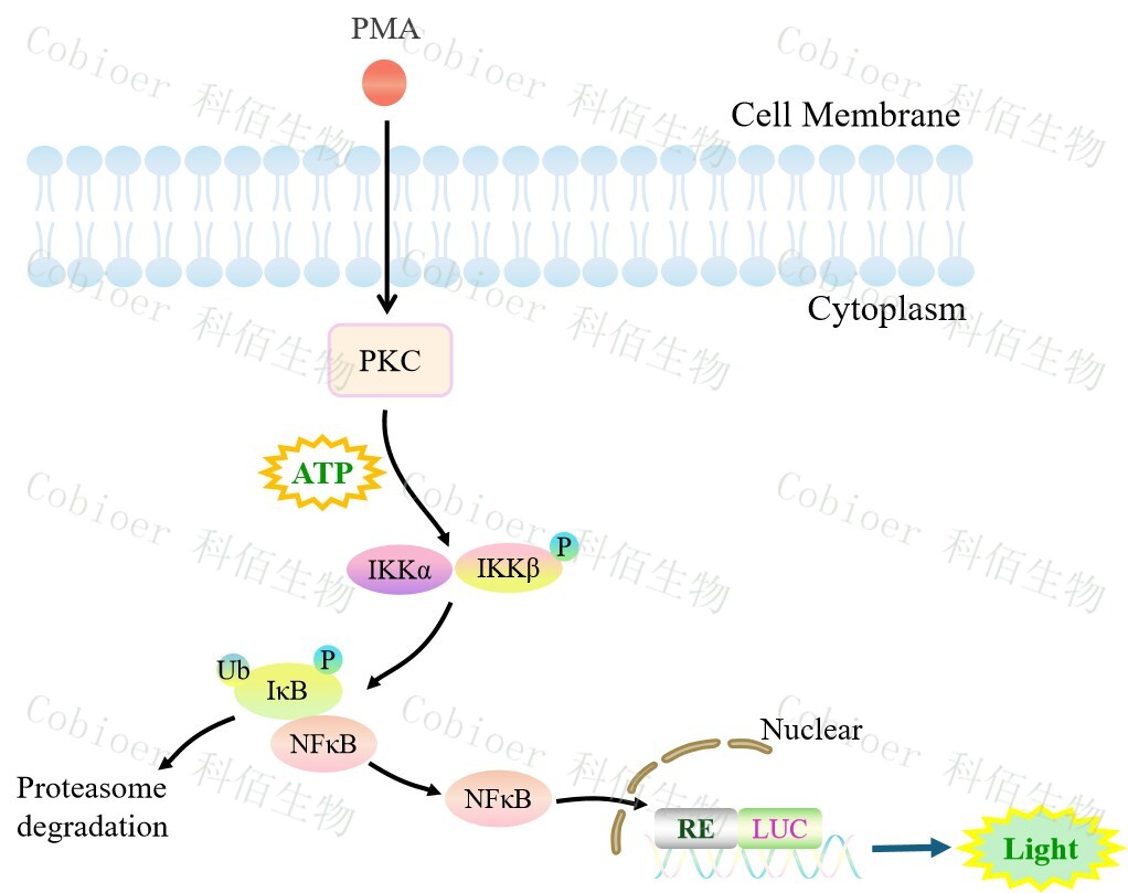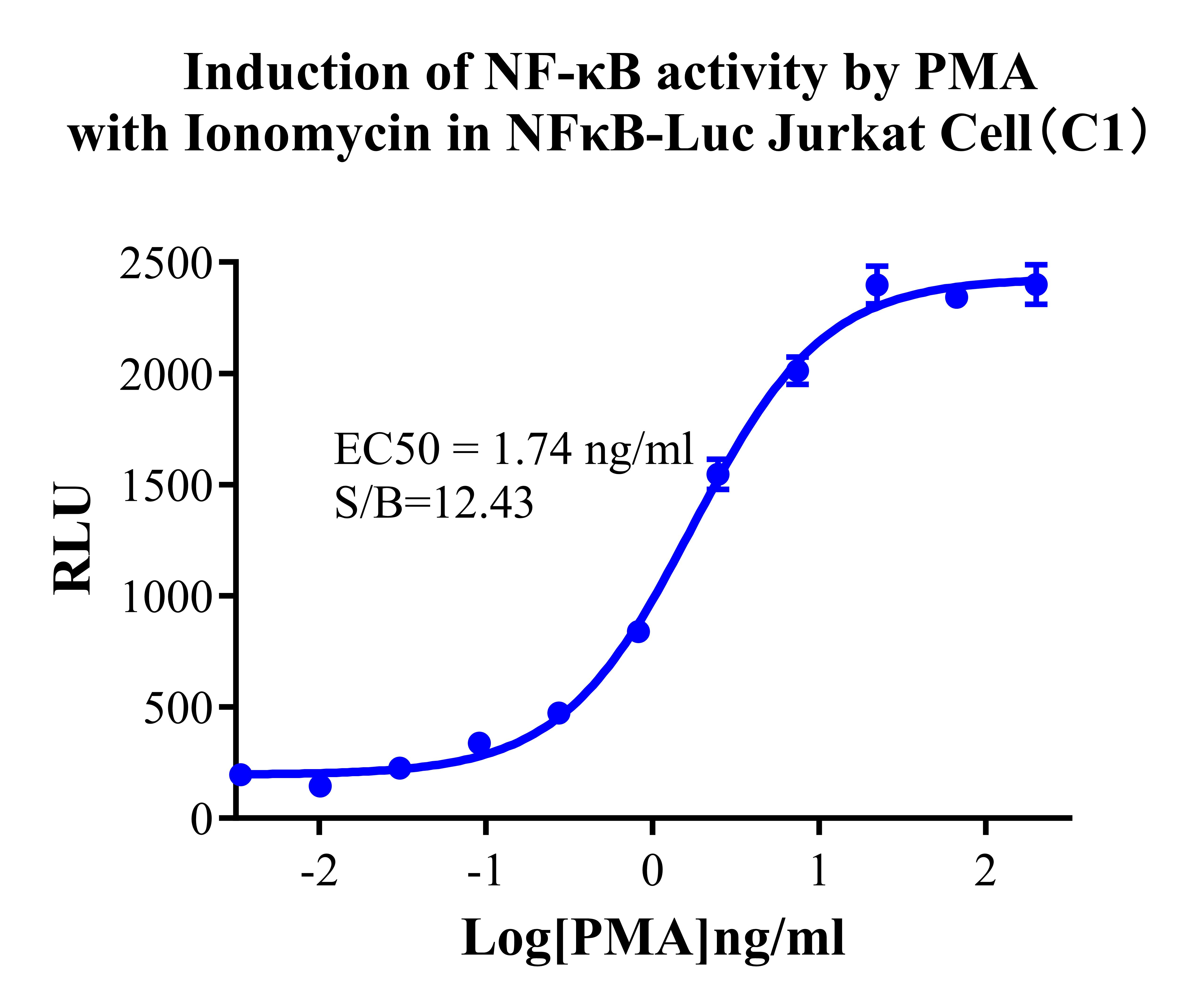 NFκB-Luc Jurkat 報(bào)告基因細(xì)胞是由 NFκB 調(diào)控并表達(dá) Luc 熒光素酶報(bào) 告基因的 Jurkat細(xì)胞。PMA 是 DAG(二酯酰甘油)的類似物,可自由的通過細(xì)胞膜,直接 作用于細(xì)胞活化信號(hào)轉(zhuǎn)導(dǎo)通路上的 PKC,原理見下圖所示。![]() Figure 1. NFκB-Luc Jurkat 細(xì)胞模型原理圖