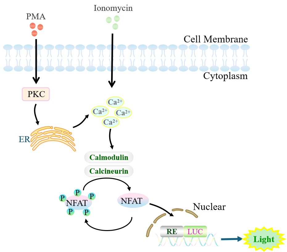 NFAT-Luc Jurkat 報告基因藥靶模型很好的模擬了體內(nèi) NFAT 的信號轉(zhuǎn)導(dǎo)過程,原理見下圖所示。