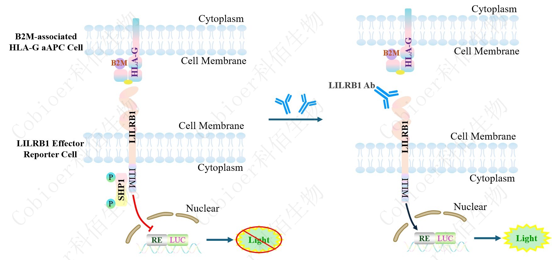 LILRB1 Effector Reporter Cell 報告基因藥靶模型很好的模擬了體內(nèi) LILRB1 的信號轉(zhuǎn)導(dǎo)過程,原理見下圖所示。![]() Figure 1. LILRB1 Effector Reporter Cell 模型原理圖 |