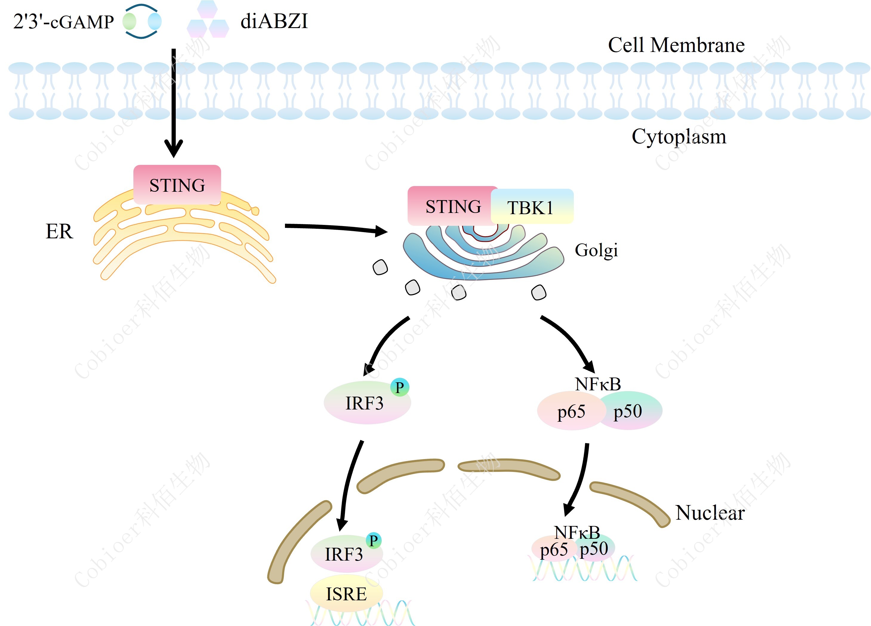| STING(干擾素基因刺激因子)又稱 MPYS、TMEM173、MITA 和 ERIS,是一種跨膜蛋白,是環(huán)狀二核苷酸(CDN)的直接傳感器。CDN 是細(xì)菌信號(hào)轉(zhuǎn)導(dǎo)中普遍存在的第二信使分子,是哺乳動(dòng)物細(xì)胞的防御觸發(fā)器。當(dāng)細(xì)菌病原體攻擊時(shí),釋放到細(xì)胞中的 CDN 直接與 STING 結(jié)合,激活的 STING 和 TANK 結(jié)合激酶-I (TBK1) 相互作用以誘導(dǎo)活性干擾素調(diào)節(jié)因子 (IRF3) 二聚體,然后該二聚體與細(xì)胞核中的干擾素刺激反應(yīng)元件 (ISRE) 結(jié)合并導(dǎo)致 IFN-α/β 的產(chǎn)生。IFNβ 的產(chǎn)生是 STING 活化的標(biāo)志。腫瘤微環(huán)境(TME)中由于天然免疫產(chǎn)生的信號(hào)傳導(dǎo)是導(dǎo)致腫瘤特異性 T 細(xì)胞激活和腫瘤浸潤性淋巴細(xì)胞(TIL)浸潤的關(guān)鍵因素。其中尤其以 I 型 IFN 對(duì)腫瘤特異性 T 細(xì)胞的活化最為關(guān)鍵。因此,STING 激動(dòng)劑可以通過誘導(dǎo)Ⅰ型干擾素基因的表達(dá),激活包括樹突狀細(xì)胞等免疫刺激細(xì)胞,改變腫瘤微環(huán)境并誘導(dǎo)腫瘤特異性 T 細(xì)胞的產(chǎn)生,從而通過調(diào)節(jié)免疫系統(tǒng)達(dá)到抗腫瘤的目的。 | |