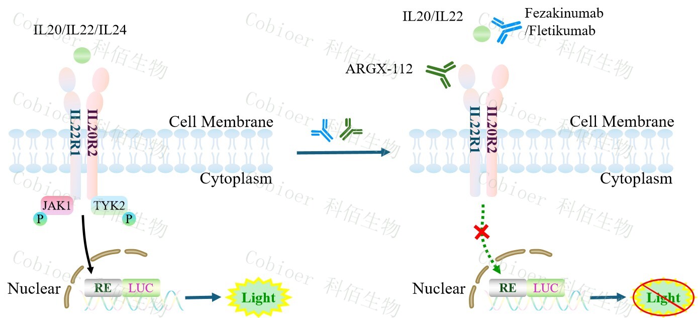 hIL20/IL22/IL24 Triple Effector Reporter Cell 報告基因藥靶模型很好的模擬了體內(nèi)IL20/IL22/IL24 的信號轉導過程,原理見下圖所示。