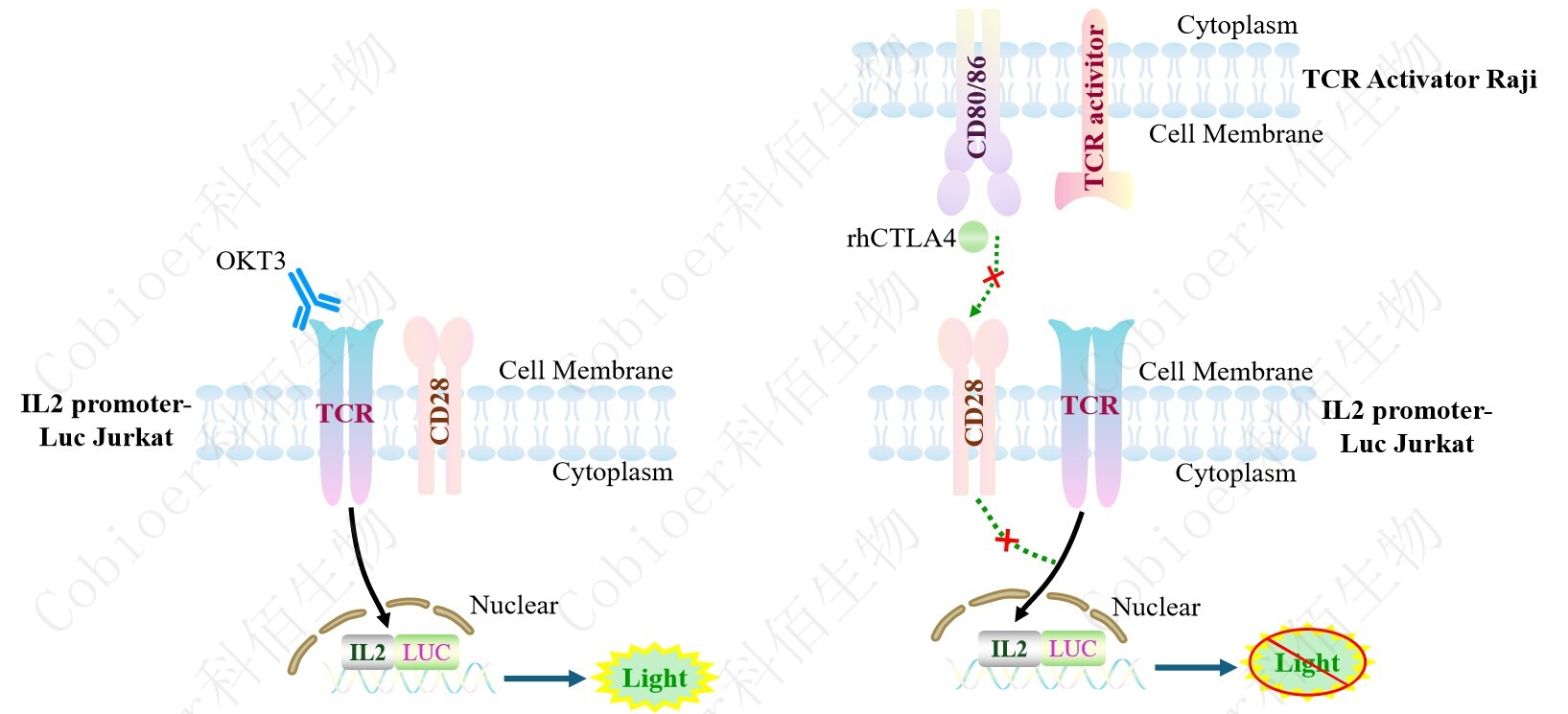 IL2 promoter-Luc Jurkat 報(bào)告基因藥靶模型很好的模擬了體內(nèi) IL2 的信號(hào)轉(zhuǎn)導(dǎo)過(guò)程,原 理見(jiàn)下圖所示。![]() |