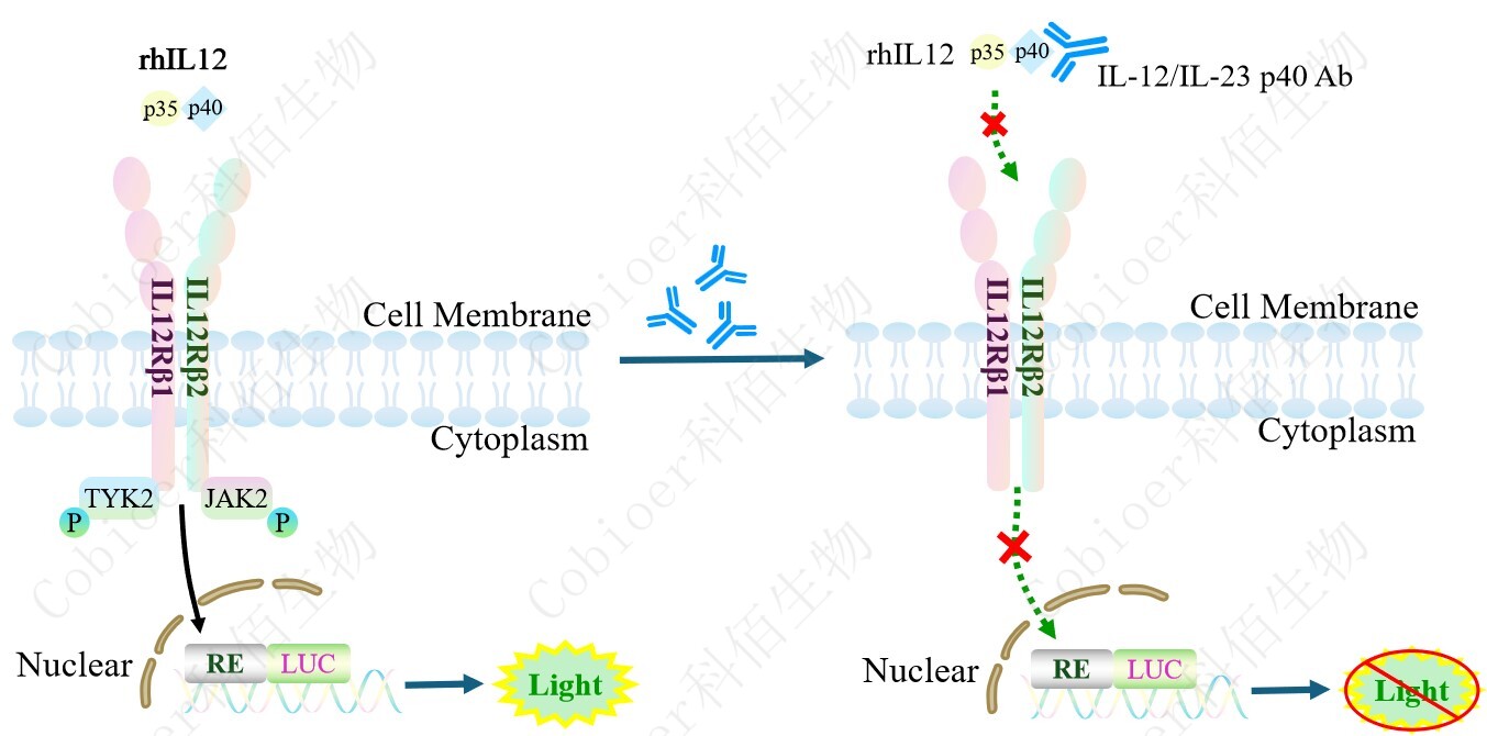 IL12 Effector Reporter Cell 報告基因藥靶模型很好的模擬了體內(nèi) IL12 的信號轉(zhuǎn)導(dǎo)過程, 原理見下圖所示。 ![]() Figure 1. IL12 Effector Reporter Cell 細胞模型原理圖 |