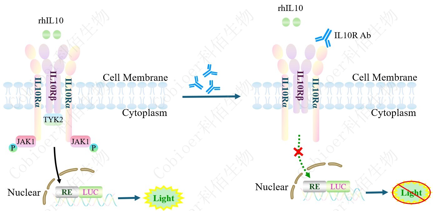 IL10 Effector Reporter Cell 報告基因藥靶模型很好的模擬了體內(nèi) IL10 的信號轉(zhuǎn)導(dǎo)過程, 原理見下圖所示。![]() Figure 1. IL10 Effector Reporter Cell 細(xì)胞模型原理圖