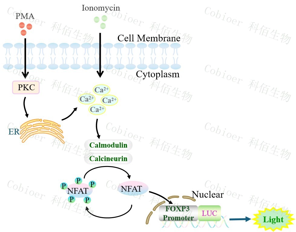 FOXP3 promoter-Luc Jurkat 報(bào)告基因細(xì)胞,是由 FOXP3 調(diào)控并表達(dá) Luc 熒光素酶報(bào)告基因的 Jurkat 細(xì)胞。PMA 是 DAG(二酯酰甘油)的類似物,可自由的通過 細(xì)胞膜,可用于測(cè)定 CD3/CD28 介導(dǎo)的 T 細(xì)胞活化,原理見下圖所示。