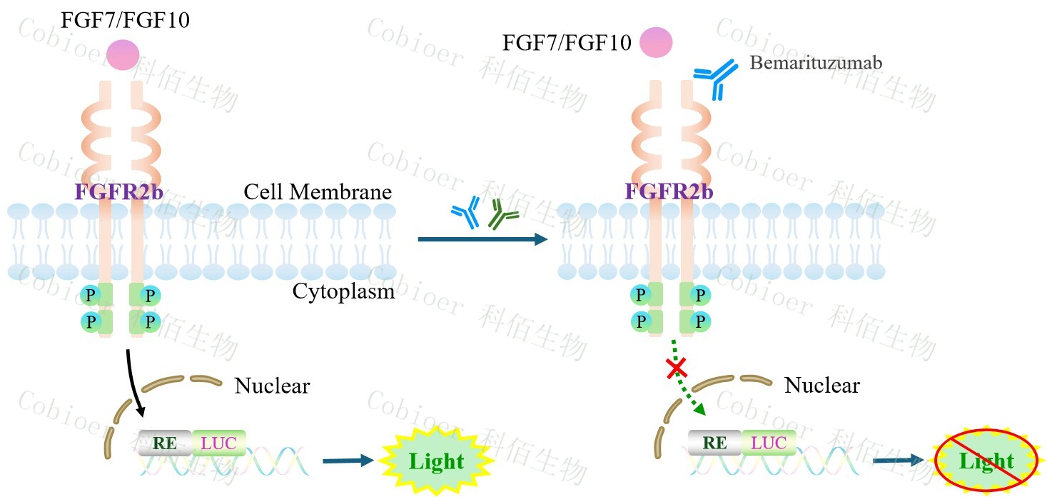 FGFR2b Effector Reporter Cell 報(bào)告基因藥靶模型很好的模擬了體內(nèi) FGFR2b 的信號(hào)轉(zhuǎn) 導(dǎo)過(guò)程,原理見(jiàn)圖 所示。![]() Figure 1. FGFR2b Effector Reporter Cell 細(xì)胞模型原理圖 |
