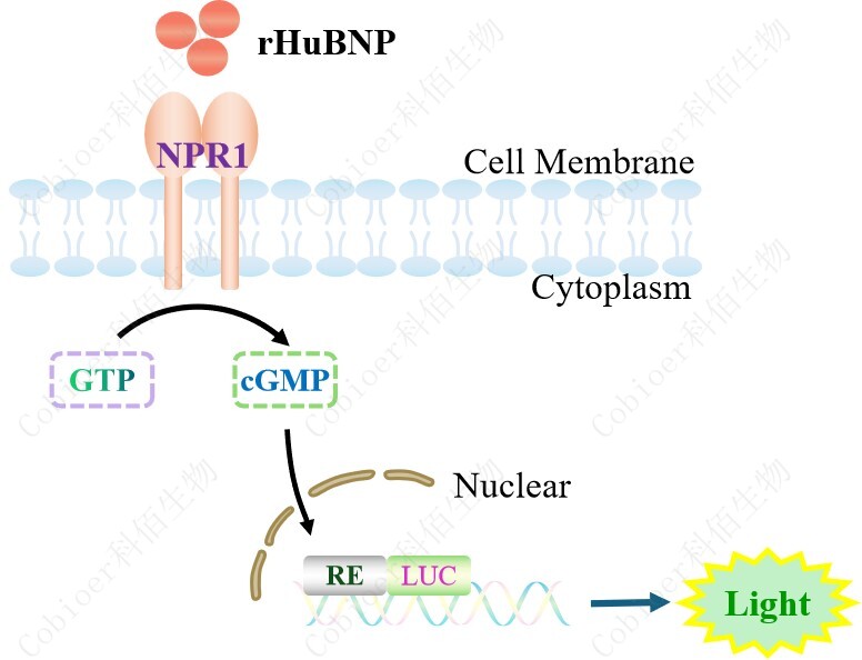 BNP/NPR1 Effector Reporter Cell 報(bào)告基因藥靶模型很好的模擬了體內(nèi) NPR1 的信號(hào)轉(zhuǎn)導(dǎo)過(guò)程,原理見(jiàn)下圖所示。![]() Figure 1. BNP/NPR1 Effector Reporter Cell 細(xì)胞模型原理圖 |
