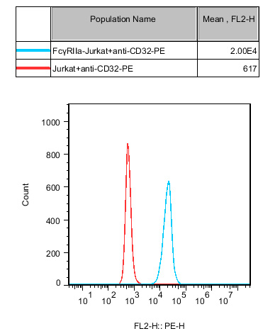 Figure 2.ADCP Bioassay Effector Cell FcγRIIa(R variant) -NFAT Jurkat 細胞流式驗證 FcγRⅡa 的表達。 |