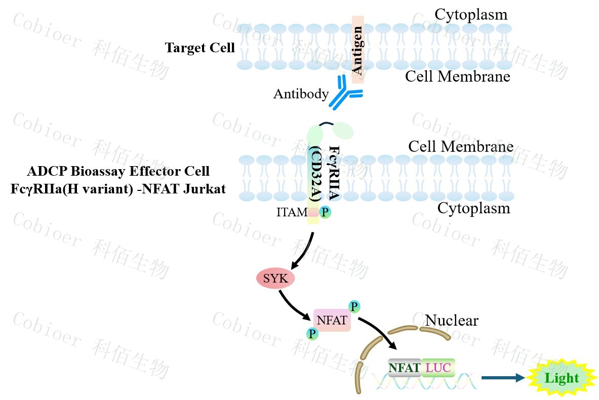 ADCP Bioassay Effector Cell FcγRIIa(H variant) -NFAT Jurkat 報告基因藥靶模型很好的 模擬了體內(nèi) ADCP 的信號轉(zhuǎn)導過程,原理見下圖所示。