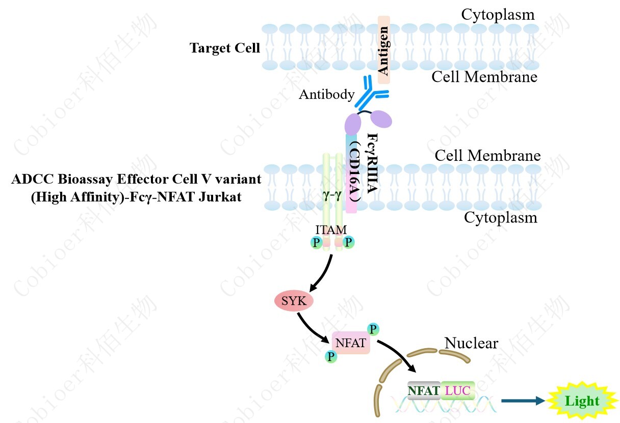 ADCC Bioassay Effector Cell V variant (High Affinity)-Fcγ-NFAT Jurkat 報(bào)告基因藥靶模 型很好的模擬了體內(nèi) ADCC 的信號轉(zhuǎn)導(dǎo)過程,原理見下圖所示。