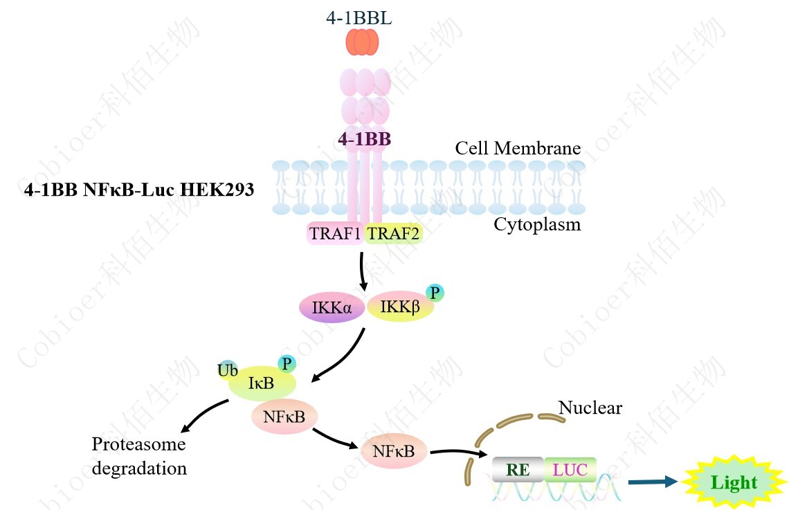 4-1BB NFκB-Luc HEK293 報告基因藥靶模型很好的模擬了體內(nèi) 4-1BB 的信號轉(zhuǎn)導(dǎo)過程, 原理見下圖所示。