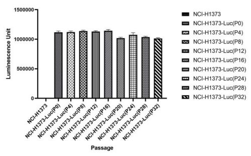 Figure. Stablity test results. NCI-H1373-Luc cells showed at least 32 passage stability with similar luminescence unit. |