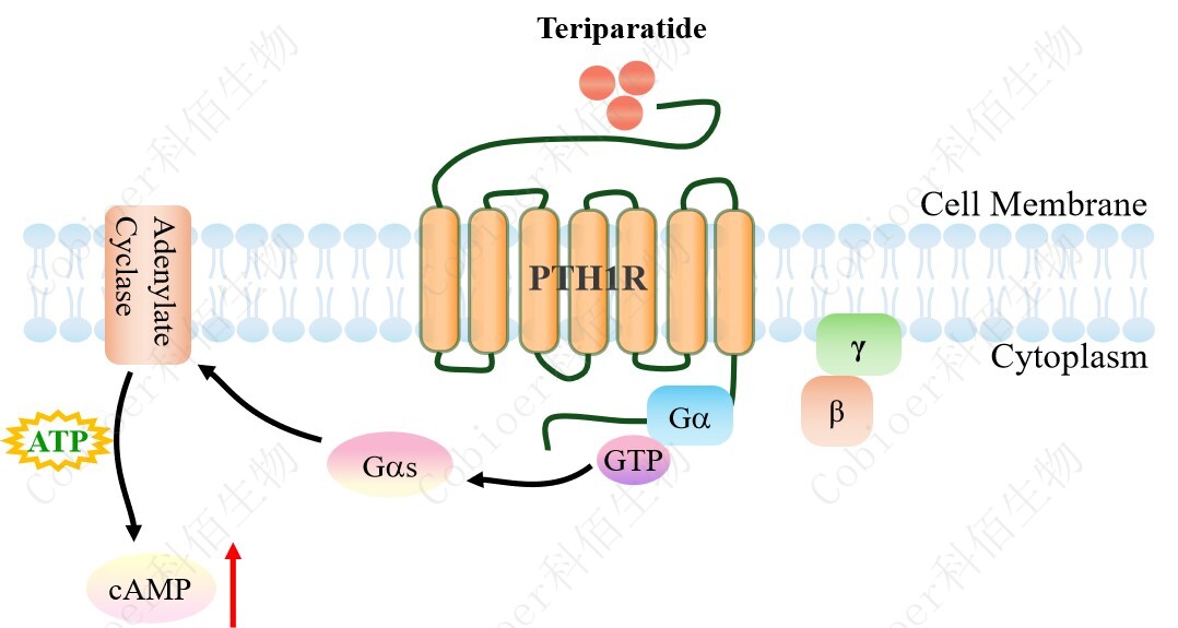 Ⅰ型甲狀旁腺激素受體 (PTH1R) 是一種 G 蛋白偶聯(lián)七跨膜受體 (GPCR),是內(nèi)源性PTH 和 PTH 相關(guān)蛋白 (PTHrP) 配體的主要功能性受體。PTH1R 在調(diào)節(jié)鈣代謝、骨骼發(fā)育和體內(nèi)平衡方面起著關(guān)鍵作用。PTH1R 受體由三個功能域組成。N 末端胞外結(jié)構(gòu)域負(fù)責(zé)識別和結(jié)合配體。七個跨膜螺旋的中間結(jié)構(gòu)域傳遞激素結(jié)合信號并與 G 蛋白相互作用。C 末端胞內(nèi)結(jié)構(gòu)域接收信號,隨后與 G 蛋白相互作用,激活下游信號通路。當(dāng)配體與 PTH1R結(jié)合時,會誘導(dǎo)受體構(gòu)象變化,從而激活多種下游信號轉(zhuǎn)導(dǎo)通路,這些通路可通過 G 蛋白依賴性或 G 蛋白非依賴性/β-Arrestin 機(jī)制激活。