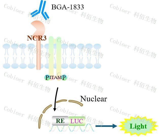 NCR3(NKp30) Effector Reporter 報告基因藥靶模型很好的模擬了體內(nèi) NKp30 的信號 轉(zhuǎn)導(dǎo)過程,原理見下圖所示。![]() Figure 1. NCR3(NKp30) Effector Reporter 細胞模型原理圖 |