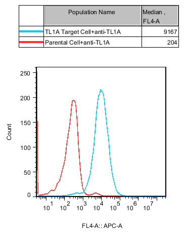IV. Representative Data![]() Figure 2. Recombinant TL1A Target Cell stably expressing TL1A. ![]() Figure 3. Blocking of TLlA induced DR3 Effector Reporter Cell(C15) Activity by TLlA Neutralizaiton Abs with TL1A Target Cell. |