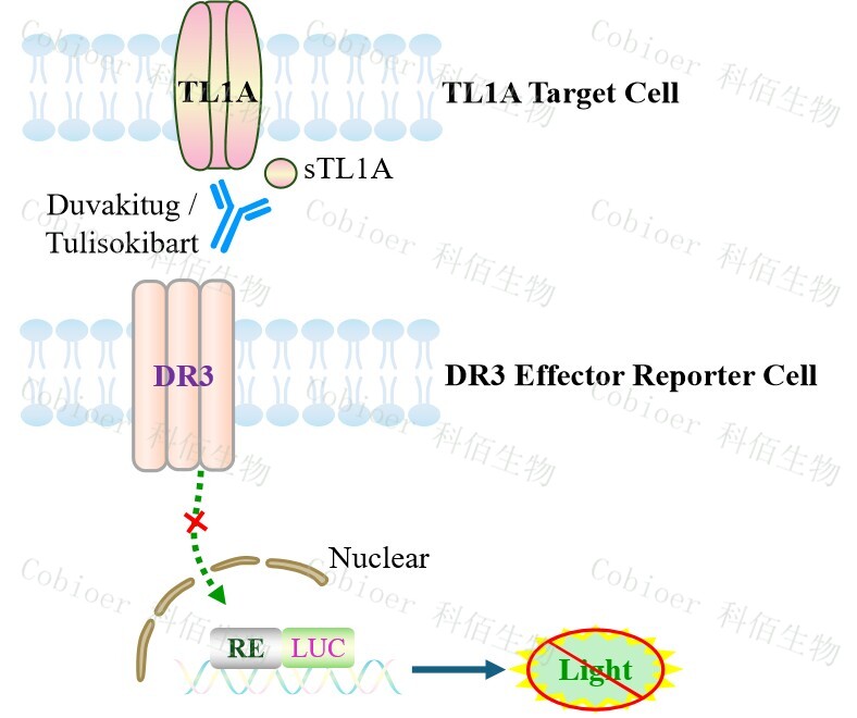 TL1A Target Cell 作為 DR3 Effector Reporter Cell 的靶細(xì)胞,很好的模擬了體內(nèi) DR3 的 信號轉(zhuǎn)導(dǎo)過程,原理見下圖所示。