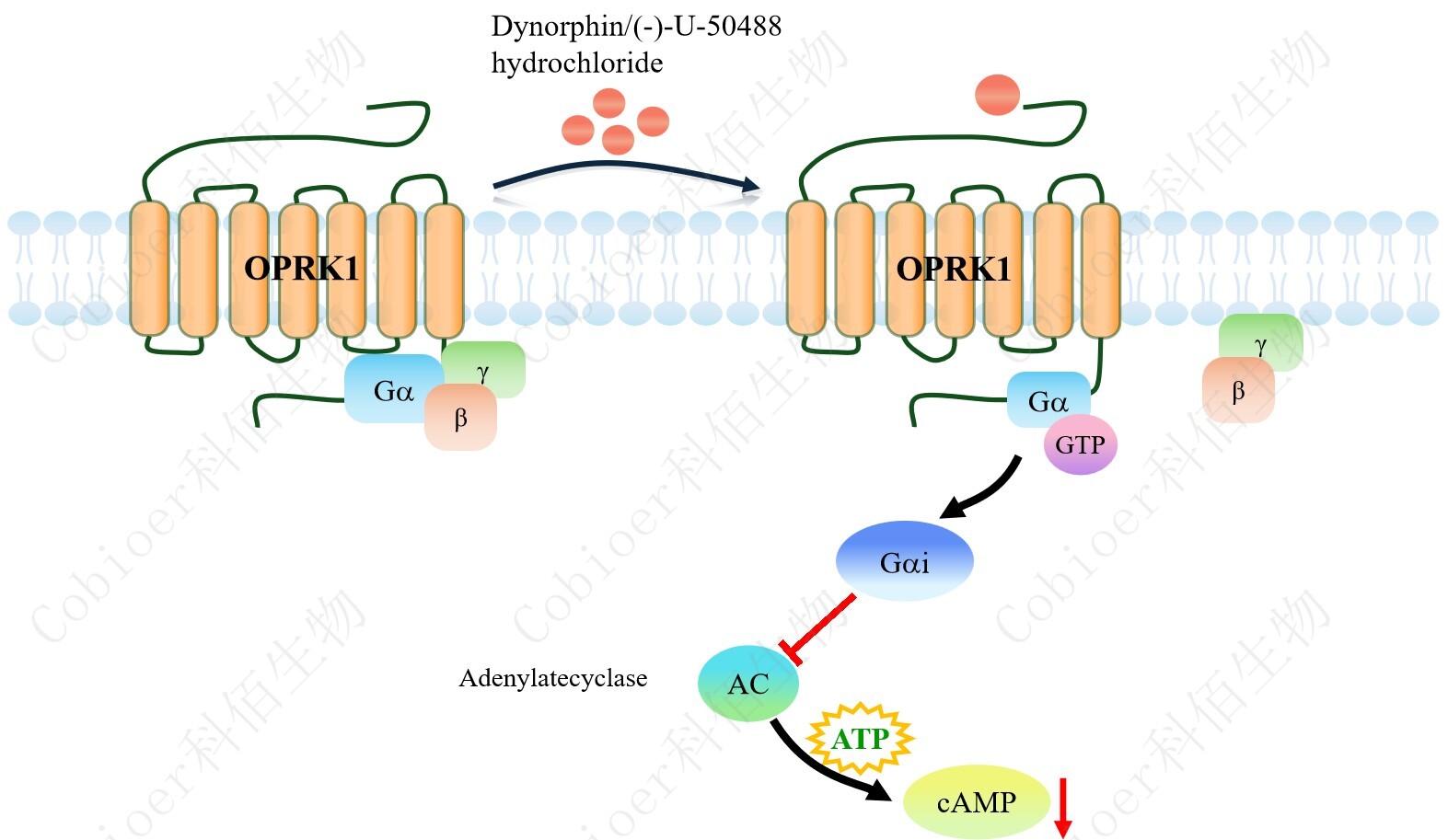 cAMP 在 G 蛋白偶聯(lián)受體(GPCR)信號轉(zhuǎn)導中是一種關(guān)鍵的第二信使。當配體結(jié)合到 GPCR,構(gòu)象發(fā)生變化,激活受體接著激活 G 蛋白,Gi 的激活導致腺苷酸環(huán)化酶調(diào)控 cAMP 的下調(diào)。OPRK1 CHO 藥靶模型很好的模擬了體內(nèi) OPRK1 的信號轉(zhuǎn)導過程,原理見下圖 所示。 |