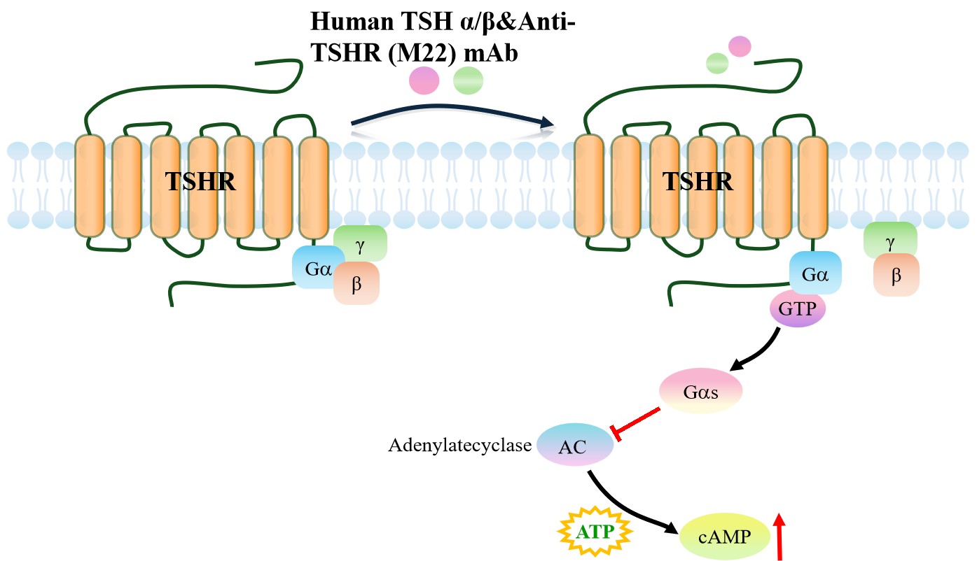 cAMP 在 G 蛋白偶聯(lián)受體(GPCR)信號(hào)轉(zhuǎn)導(dǎo)中是一種關(guān)鍵的第二信使。當(dāng)配體結(jié)合 到 GPCR,構(gòu)象發(fā)生變化,激活受體接著激活 G 蛋白,Gs 的激活導(dǎo)致腺苷酸環(huán)化酶調(diào)控 cAMP 的升高。TSHR 藥靶模型很好的模擬了體內(nèi) TSHR 的信號(hào)轉(zhuǎn)導(dǎo)過程,原理見下圖所示。 |