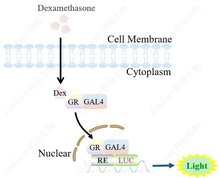 由 GR-GAL4 調(diào) 控并表達(dá) Luc 熒光素酶報(bào)告基因的 HEK293 細(xì)胞。Dexamethasone (Hexadecadrol,地塞米 松)是糖皮質(zhì)激素受體 (Glucocorticoid Receptor)激動(dòng)劑、凋亡誘導(dǎo)劑,原理見(jiàn)下圖所示。![]() Figure 1. GR-GAL4 Luciferase Reporter HEK293 細(xì)胞原理示意圖 |