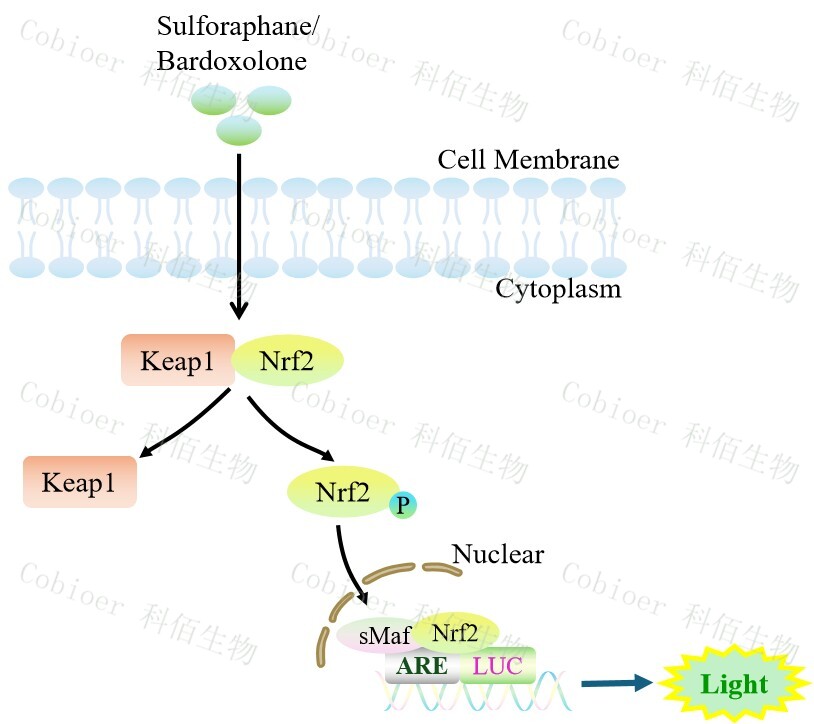 ARE-Luc MCF7 報(bào)告基因細(xì)胞,是由 ARE 調(diào)控并表達(dá) Luc 熒光素酶報(bào) 告基因的 MCF7 細(xì)胞。Sulforaphane 是 Keap1/Nrf2/ARE 的誘導(dǎo)劑,Bardoxolone 是 NRf2 的 激活劑,原原理見下圖所示。![]() |