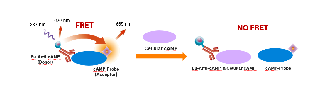 Cellular cyclic AMP Detection KIT是一種競爭性的檢測技術(shù),檢測細胞內(nèi)cAMP的量。藥物同貼壁細胞或者懸浮細胞共處理后,能通過此KIT檢測出藥物對細胞的作用。 檢測原理采用TR-FRET檢測技術(shù)。細胞內(nèi)天然的cAMP同cAMP-Probe競爭性結(jié)合Eu -Anti-cAMP。最終檢測出來的信號與樣本中cAMP的濃度成反比。