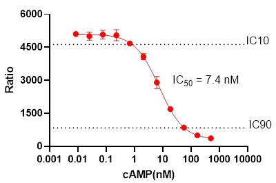 測試標準品的反應曲線,以確定實驗室中Stimulation Buffer或者細胞培養(yǎng)基的檢測線性動態(tài)范圍。這還將驗證實驗中是否產(chǎn)生了預期的 S/B 和 cAMP的IC50值。 特別是IC10 和 IC90的數(shù)值將在實驗中非常有用,可以用于優(yōu)化細胞系的細胞密度。