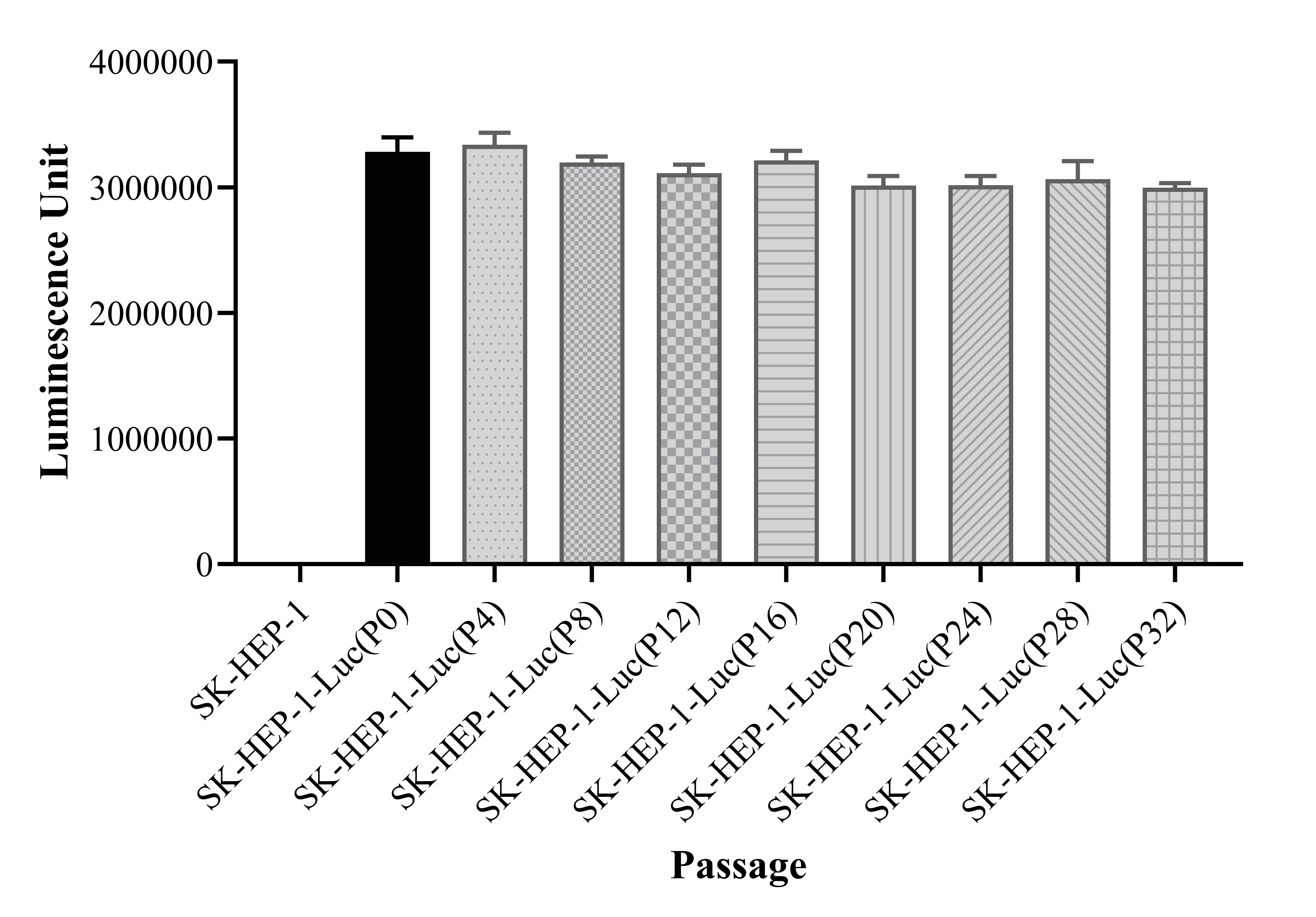Figure 1. Stablity test results. SK-HEP-1-Luc showed at least 32 passage stability with similar luminescence unit. |