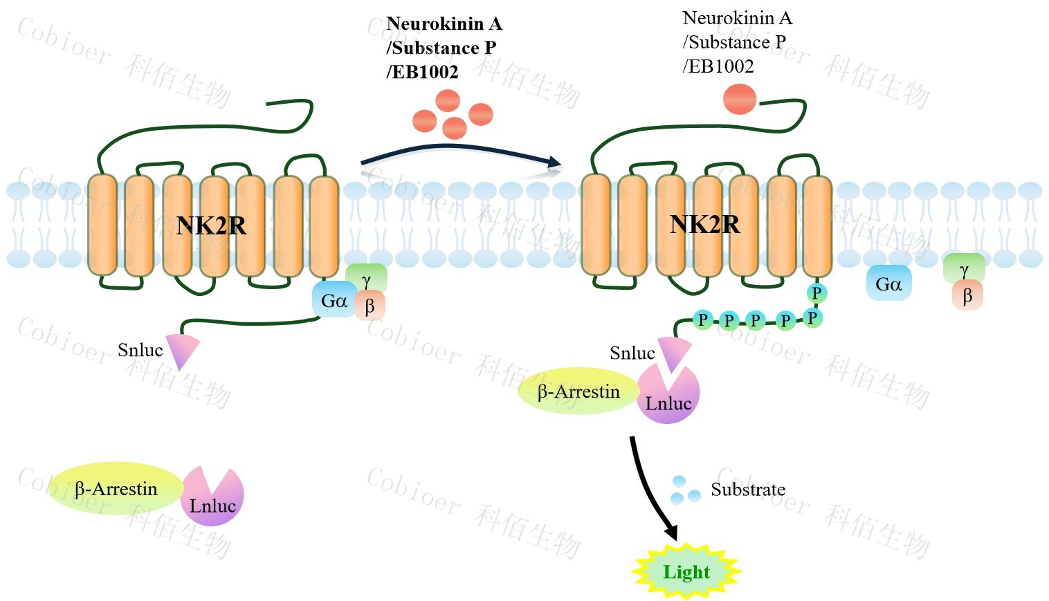 NK2R β-Arrestin CHO 報告基因藥靶模型很好的模擬了體內 NK2R/β-Arrestin 的信號轉 導過程,原理見下圖所示。當缺乏配體刺激時,β-Arrestin 不與 NK2R 結合,融合β-Arrestin 的熒光素酶處于失活構象,當 NK2R 遭遇配體刺激時,融合熒光素酶報告基因的β-Arrestin 被招募,使熒光素酶報告基因處于激活狀態(tài),加入其底物后發(fā)光信號增強。