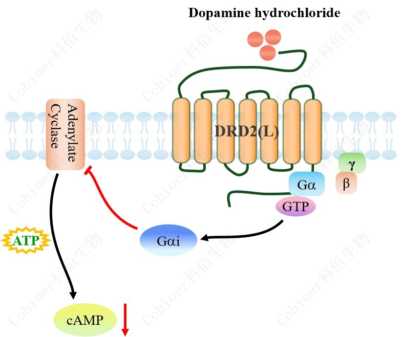 cAMP 在 G 蛋白偶聯(lián)受體(GPCR)信號轉(zhuǎn)導(dǎo)中是一種關(guān)鍵的第二信使。當(dāng)配體結(jié)合 到 GPCR,構(gòu)象發(fā)生變化,激活受體接著激活 G 蛋白,Gi 的激活導(dǎo)致腺苷酸環(huán)化酶調(diào)控 cAMP 的下調(diào)。DRD2 (L) HEK293 藥靶模型很好的模擬了體內(nèi) DRD2 的信號轉(zhuǎn)導(dǎo)過程,原理見下圖所示。
