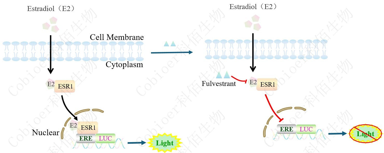 ESR1 ERE-Luc Hela Cell,是由 ERE 調(diào)控并表達(dá) Luc 熒光素酶報(bào)告基因 的 Hela 細(xì)胞。β-雌二醇(17β-Estradiol,E2)是人體內(nèi)活性最強(qiáng)的雌激素,主要通過(guò)結(jié)合 ER 發(fā)揮作用,調(diào)控基因表達(dá)和細(xì)胞功能,原理見(jiàn)下圖所示。![]() Figure 1. ESR1 ERE-Luc Hela Cell 原理示意圖 |