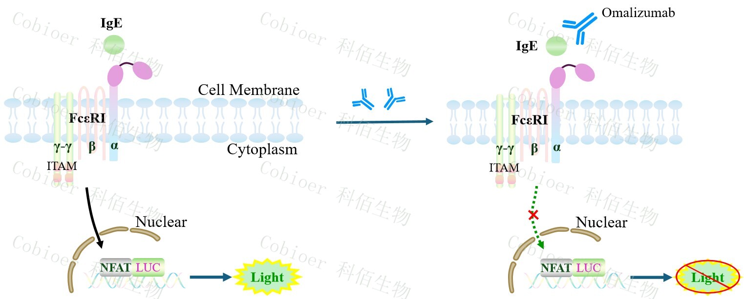 FcεRI Effector Reporter Cell 藥靶模型很好的模擬了 FcεRI的信號轉(zhuǎn)導(dǎo)過程,原理見下圖所示。