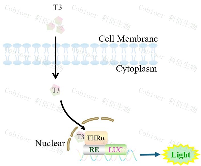 THRA Luciferase Reporter HEK293,是由 THRA 調控并表達 Luc 熒光素 酶報告基因的 HEK293 細胞。甲狀腺激素(T3/T4)是一種有效的甲狀腺激素,主要通過結 合 TRs 發(fā)揮作用,調控基因表達和細胞功能,原理見下圖所示。 ![]() Figure 1. THRA Luciferase Reporter HEK293 原理示意圖