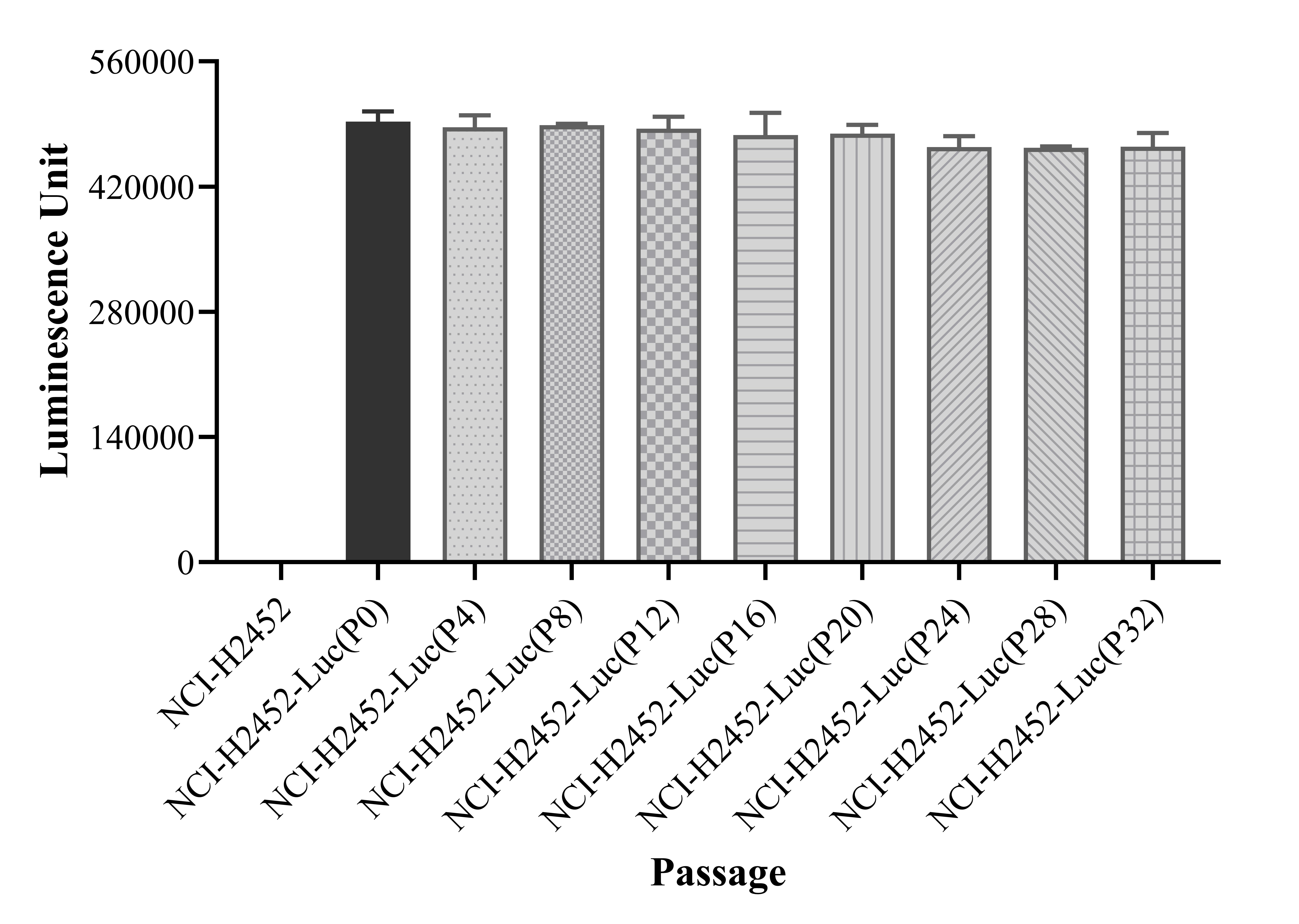 Figure 1. Stablity test results. NCI-H2452-Luc showed at least 32 passage stability with similar luminescence unit.