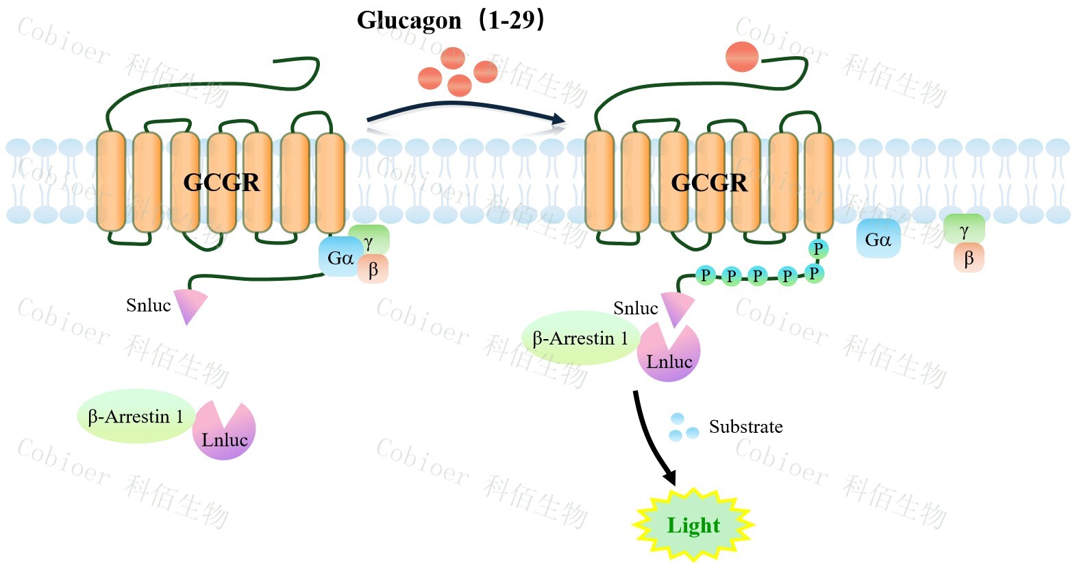 GCGR β-Arrestin 1 CHO 報(bào)告基因藥靶模型很好的模擬了體內(nèi) GCGR/β-Arrestin 1 的信 號(hào)轉(zhuǎn)導(dǎo)過(guò)程,原理見(jiàn)下圖所示。當(dāng)缺乏配體刺激時(shí),β-Arrestin 1 不與 GCGR 結(jié)合,融合β- Arrestin 1 的熒光素酶處于失活構(gòu)象;當(dāng) GCGR 遭遇配體刺激時(shí),融合熒光素酶報(bào)告基因的 β-Arrestin 1 被招募,使熒光素酶報(bào)告基因處于激活狀態(tài),加入其底物后發(fā)光信號(hào)增強(qiáng)。![]() Figure 1. GCGR β-Arrestin 1 CHO 細(xì)胞模型原理圖 |