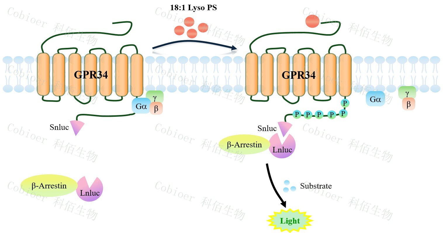 GPR34 β-Arrestin CHO 報告基因藥靶模型很好的模擬了體內(nèi) GPR34/β-Arrestin 的信號 轉(zhuǎn)導(dǎo)過程,原理見下圖所示。當(dāng)缺乏配體刺激時,β-Arrestin 不與 GPR34 結(jié)合,融合β- Arrestin 的熒光素酶處于失活構(gòu)象,當(dāng) GPR34 遭遇配體刺激時,融合熒光素酶報告基因的 β-Arrestin 被招募,使熒光素酶報告基因處于激活狀態(tài),加入其底物后發(fā)光信號增強。![]() Figure 1. GPR34 β-Arrestin CHO 細(xì)胞模型原理圖 |