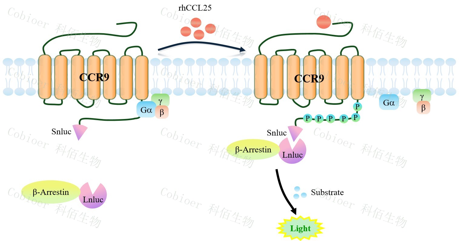 CCR9 β-Arrestin CHO 報告基因藥靶模型很好的模擬了體內(nèi) CCR9/β-Arrestin 的信號轉(zhuǎn)導過程,原理見下圖所示。當缺乏配體刺激時,β-Arrestin 不與 CCR9 結(jié)合,融合β-Arrestin 的熒光素酶處于失活構(gòu)象,當 CCR9 遭遇配體刺激時,融合熒光素酶報告基因的β-Arrestin 被招募,使熒光素酶報告基因處于激活狀態(tài),加入其底物后發(fā)光信號增強。![]() Figure 1. CCR9 β-Arrestin CHO 細胞模型原理圖 |