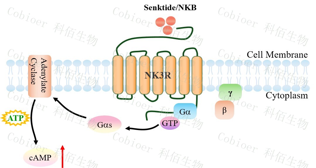 | 速激肽(Tachykinin)是在整個(gè)神經(jīng)和免疫系統(tǒng)中表達(dá)的神經(jīng)肽,作為興奮性神經(jīng)遞質(zhì), 它們?cè)谡{(diào)節(jié)各種生理功能中發(fā)揮重要的作用。在不同的速激肽中,P 物質(zhì)(SP)、神經(jīng)激 肽 A(NKA) 和 NKB 已得到充分研究。這些肽可以通過(guò)三種不同的 GPCR、神經(jīng)激肽 1 受體(NK1R)、神經(jīng)激肽 2 受體(NK2R) 和 NK3R 發(fā)揮作用。作為具有不同親和力的 完全激動(dòng)劑。 NK3R(Neurokinin 3 Receptor),又稱 TACR3,是速激肽受體家族的重要成員,屬于 GPCR 超家族。其內(nèi)源性配體為神經(jīng)激肽 B(Neurokinin B, NKB),通過(guò)激活下游信號(hào)通 路參與生殖調(diào)控、神經(jīng)內(nèi)分泌調(diào)節(jié)及多種疾病進(jìn)程。近年來(lái),NK3R 成為治療更年期癥狀、 神經(jīng)精神疾病及癌癥的熱門靶點(diǎn)。 |