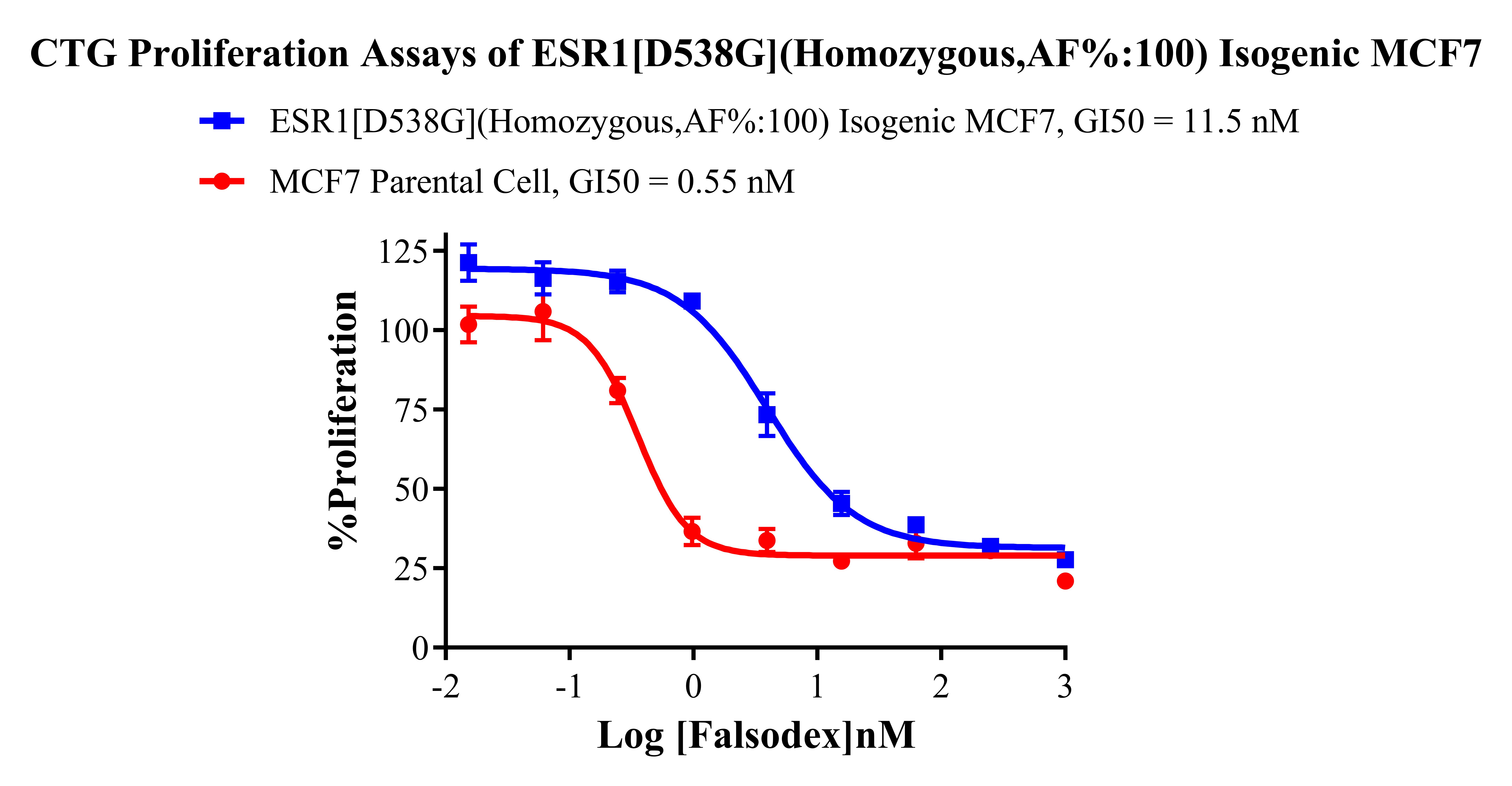 ![]() Figure 2. Sanger of ESR1[D538G](Homozygous,AF%:100) Isogenic MCF7. ![]() Figure 3. A: MCF7 Parental Cell;B:ESR1[D538G](Homozygous,AF%:100)Isogenic MCF7 通道 2 藍色微滴代表 ESR1[D538G]突變陽性,通道 2 綠色微滴代表該位點為陰性野生型 ![]() Figure 4. CTG Proliferation Assays of ESR1 [D538G](Homozygous,AF%:100) Isogenie MCF7. |