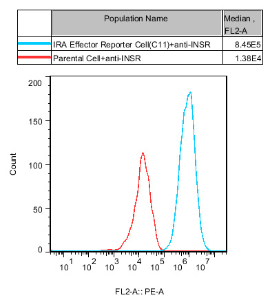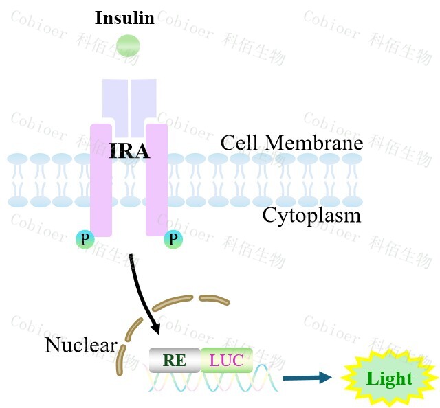 IRA Effector Reporter Cell 報(bào)告基因藥靶模型很好的模擬了體內(nèi) Insulin 的信號(hào)轉(zhuǎn)導(dǎo)過程, 原理見下圖所示。![]() Figure 1. IRA Effector Reporter Cell 細(xì)胞模型原理圖 |