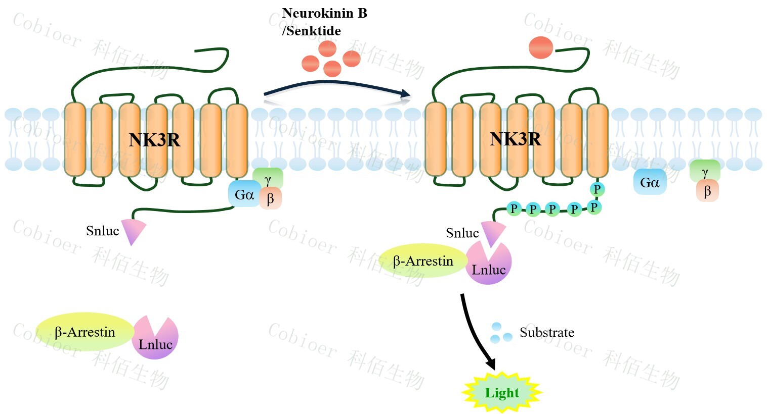 NK3R β-Arrestin CHO 報告基因藥靶模型很好的模擬了體內 NK3R/β-Arrestin 的信號轉 導過程,原理見下圖所示。當缺乏配體刺激時,β-Arrestin 不與 NK3R 結合,融合β-Arrestin 的熒光素酶處于失活構象,當 NK2R 遭遇配體刺激時,融合熒光素酶報告基因的β-Arrestin 被招募,使熒光素酶報告基因處于激活狀態(tài),加入其底物后發(fā)光信號增強。![]() Figure 1. NK3R β-Arrestin CHO 細胞模型原理圖 |